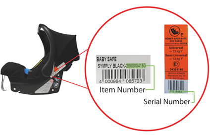 Henvend dig venligst til vores kundeservice i den forbindelse. Her vil du blive spurgt om artikel- og serienummeret. Klistermærker med varenummer og serienummer er anbragt på babystolens venstre side (i barnets retning) bagved bærehåndtagets fastgørelsessted.